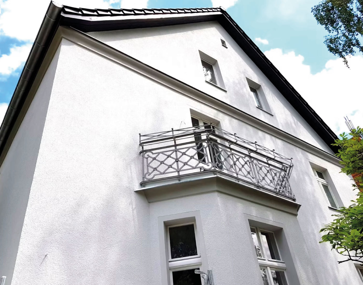 Durch sorgfältige Reparaturen, eine gründliche Untergrundvorbereitung und eine gleichmäßig deckende Neubeschichtung entstand eine ruhige, stabile und optisch klare Fassadenfläche, die die historischen Details wieder deutlich hervorhebt.